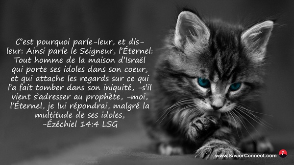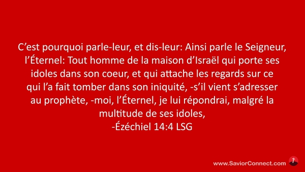 C'est pourquoi parle-leur, et dis-leur: Ainsi parle le Seigneur, l'Éternel: Tout homme de la maison d'Israël qui porte ses idoles dans son coeur, et qui attache les regards sur ce qui l'a fait tomber dans son iniquité, -s'il vient s'adresser au prophète, -moi, l'Éternel, je lui répondrai, malgré la multitude de ses idoles, -Ézéchiel 14:4 LSG