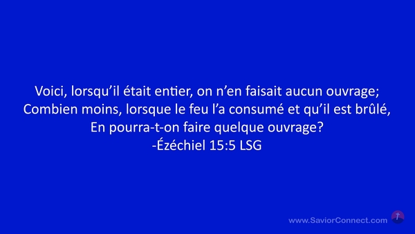 Voici, lorsqu'il était entier, on n'en faisait aucun ouvrage; Combien moins, lorsque le feu l'a consumé et qu'il est brûlé, En pourra-t-on faire quelque ouvrage? -Ézéchiel 15:5 LSG