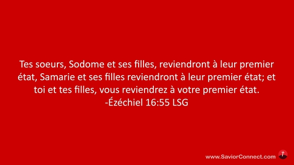 Tes soeurs, Sodome et ses filles, reviendront à leur premier état, Samarie et ses filles reviendront à leur premier état; et toi et tes filles, vous reviendrez à votre premier état. -Ézéchiel 16:55 LSG