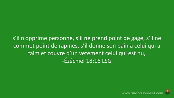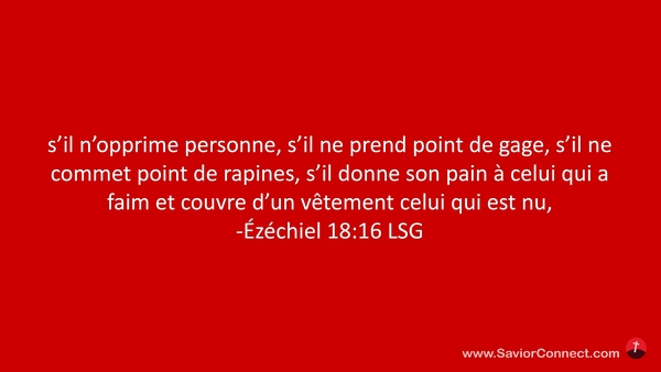 s'il n'opprime personne, s'il ne prend point de gage, s'il ne commet point de rapines, s'il donne son pain à celui qui a faim et couvre d'un vêtement celui qui est nu, -Ézéchiel 18:16 LSG