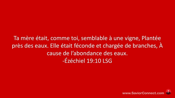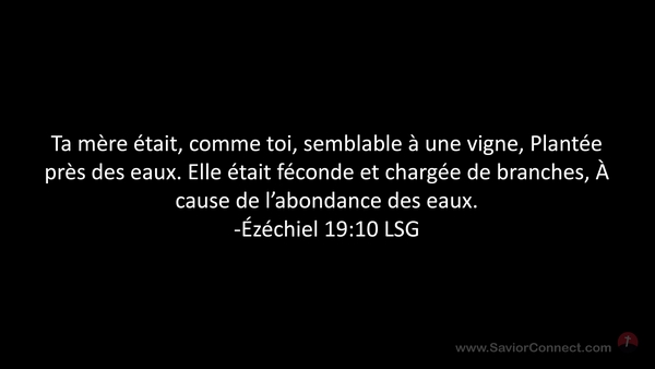 Ta mère était, comme toi, semblable à une vigne, Plantée près des eaux. Elle était féconde et chargée de branches, À cause de l'abondance des eaux. -Ézéchiel 19:10 LSG