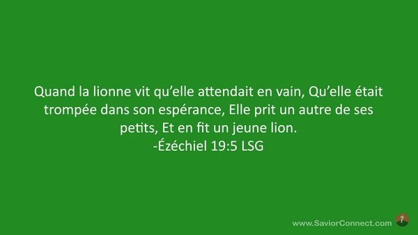 Quand la lionne vit qu'elle attendait en vain, Qu'elle était trompée dans son espérance, Elle prit un autre de ses petits, Et en fit un jeune lion. -Ézéchiel 19:5 LSG