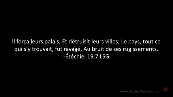 Il força leurs palais, Et détruisit leurs villes; Le pays, tout ce qui s'y trouvait, fut ravagé, Au bruit de ses rugissements. -Ézéchiel 19:7 LSG