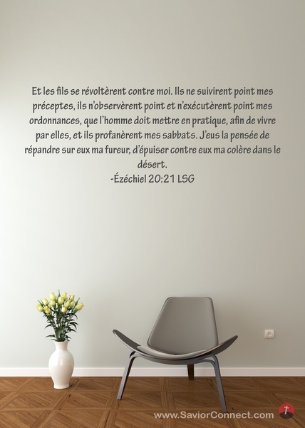 Et les fils se révoltèrent contre moi. Ils ne suivirent point mes préceptes, ils n'observèrent point et n'exécutèrent point mes ordonnances, que l'homme doit mettre en pratique, afin de vivre par elles, et ils profanèrent mes sabbats. J'eus la pensée de répandre sur eux ma fureur, d'épuiser contre eux ma colère dans le désert. -Ézéchiel 20:21 LSG