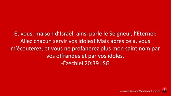 Et vous, maison d'Israël, ainsi parle le Seigneur, l'Éternel: Allez chacun servir vos idoles! Mais après cela, vous m'écouterez, et vous ne profanerez plus mon saint nom par vos offrandes et par vos idoles. -Ézéchiel 20:39 LSG