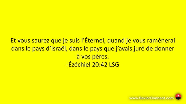 Et vous saurez que je suis l'Éternel, quand je vous ramènerai dans le pays d'Israël, dans le pays que j'avais juré de donner à vos pères. -Ézéchiel 20:42 LSG