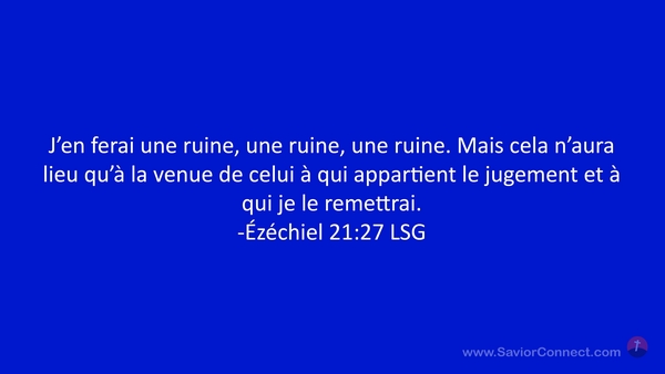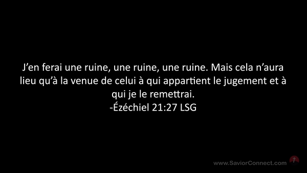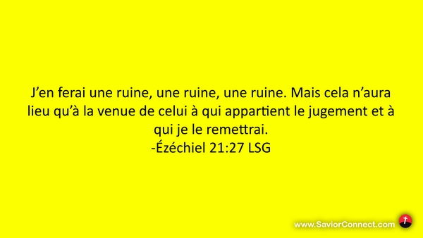 J'en ferai une ruine, une ruine, une ruine. Mais cela n'aura lieu qu'à la venue de celui à qui appartient le jugement et à qui je le remettrai. -Ézéchiel 21:27 LSG