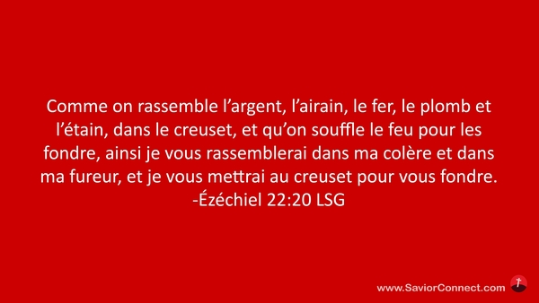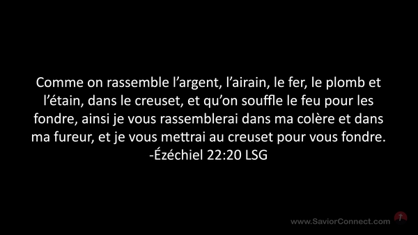Comme on rassemble l'argent, l'airain, le fer, le plomb et l'étain, dans le creuset, et qu'on souffle le feu pour les fondre, ainsi je vous rassemblerai dans ma colère et dans ma fureur, et je vous mettrai au creuset pour vous fondre. -Ézéchiel 22:20 LSG