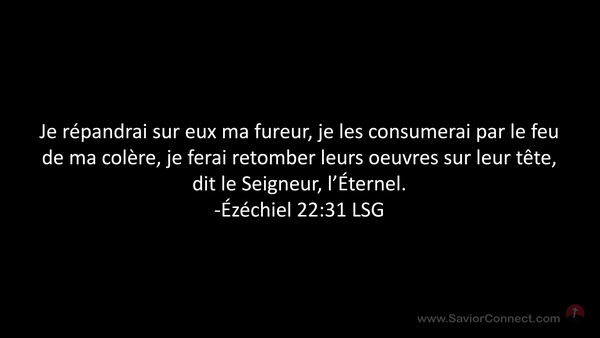 Je répandrai sur eux ma fureur, je les consumerai par le feu de ma colère, je ferai retomber leurs oeuvres sur leur tête, dit le Seigneur, l'Éternel. -Ézéchiel 22:31 LSG