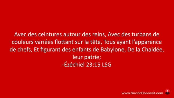 Avec des ceintures autour des reins, Avec des turbans de couleurs variées flottant sur la tête, Tous ayant l'apparence de chefs, Et figurant des enfants de Babylone, De la Chaldée, leur patrie; -Ézéchiel 23:15 LSG