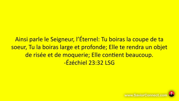 Ainsi parle le Seigneur, l'Éternel: Tu boiras la coupe de ta soeur, Tu la boiras large et profonde; Elle te rendra un objet de risée et de moquerie; Elle contient beaucoup. -Ézéchiel 23:32 LSG