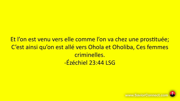 Et l'on est venu vers elle comme l'on va chez une prostituée; C'est ainsi qu'on est allé vers Ohola et Oholiba, Ces femmes criminelles. -Ézéchiel 23:44 LSG