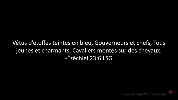 Vêtus d'étoffes teintes en bleu, Gouverneurs et chefs, Tous jeunes et charmants, Cavaliers montés sur des chevaux. -Ézéchiel 23:6 LSG