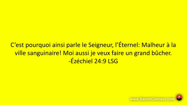 C'est pourquoi ainsi parle le Seigneur, l'Éternel: Malheur à la ville sanguinaire! Moi aussi je veux faire un grand bûcher. -Ézéchiel 24:9 LSG