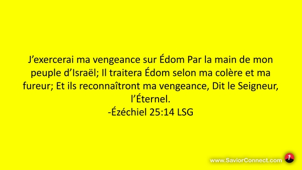 J'exercerai ma vengeance sur Édom Par la main de mon peuple d'Israël; Il traitera Édom selon ma colère et ma fureur; Et ils reconnaîtront ma vengeance, Dit le Seigneur, l'Éternel. -Ézéchiel 25:14 LSG