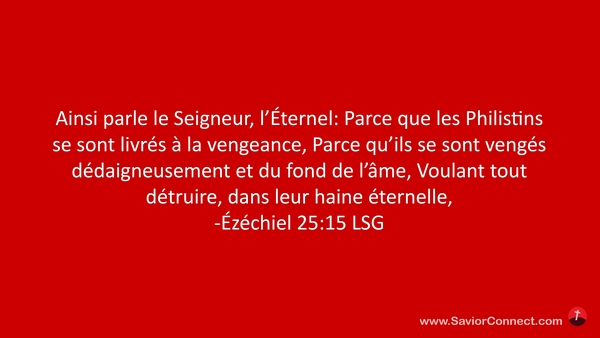 Ainsi parle le Seigneur, l'Éternel: Parce que les Philistins se sont livrés à la vengeance, Parce qu'ils se sont vengés dédaigneusement et du fond de l'âme, Voulant tout détruire, dans leur haine éternelle, -Ézéchiel 25:15 LSG