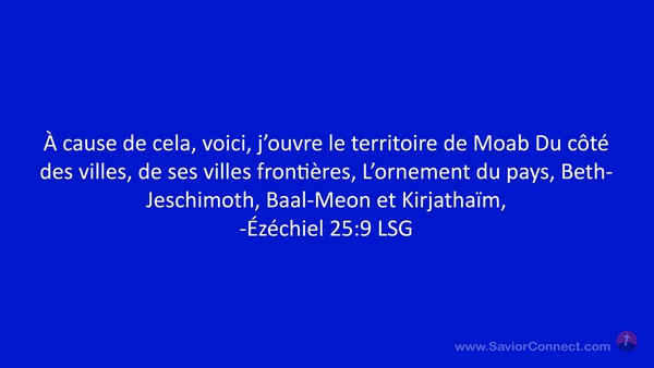 À cause de cela, voici, j'ouvre le territoire de Moab Du côté des villes, de ses villes frontières, L'ornement du pays, Beth-Jeschimoth, Baal-Meon et Kirjathaïm, -Ézéchiel 25:9 LSG