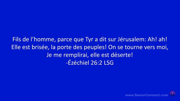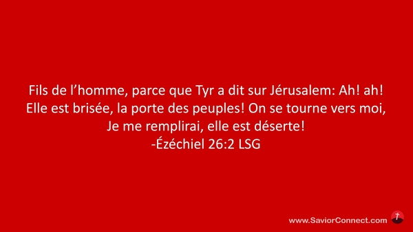 Fils de l'homme, parce que Tyr a dit sur Jérusalem: Ah! ah! Elle est brisée, la porte des peuples! On se tourne vers moi, Je me remplirai, elle est déserte! -Ézéchiel 26:2 LSG