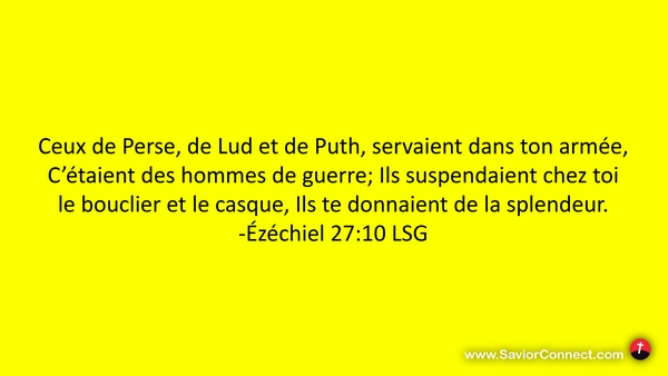 Ceux de Perse, de Lud et de Puth, servaient dans ton armée, C'étaient des hommes de guerre; Ils suspendaient chez toi le bouclier et le casque, Ils te donnaient de la splendeur. -Ézéchiel 27:10 LSG