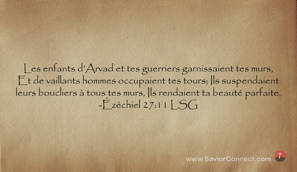 Les enfants d'Arvad et tes guerriers garnissaient tes murs, Et de vaillants hommes occupaient tes tours; Ils suspendaient leurs boucliers à tous tes murs, Ils rendaient ta beauté parfaite. -Ézéchiel 27:11 LSG