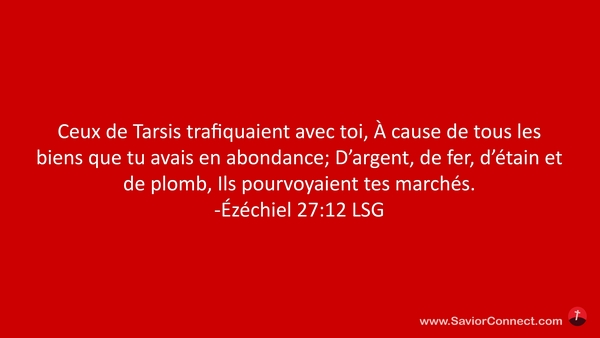 Ceux de Tarsis trafiquaient avec toi, À cause de tous les biens que tu avais en abondance; D'argent, de fer, d'étain et de plomb, Ils pourvoyaient tes marchés. -Ézéchiel 27:12 LSG