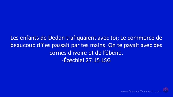 Les enfants de Dedan trafiquaient avec toi; Le commerce de beaucoup d'îles passait par tes mains; On te payait avec des cornes d'ivoire et de l'ébène. -Ézéchiel 27:15 LSG