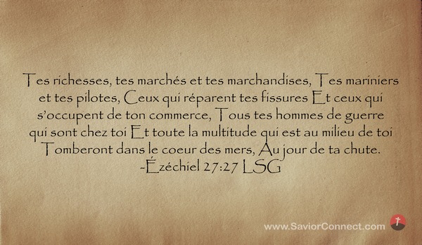 Tes richesses, tes marchés et tes marchandises, Tes mariniers et tes pilotes, Ceux qui réparent tes fissures Et ceux qui s'occupent de ton commerce, Tous tes hommes de guerre qui sont chez toi Et toute la multitude qui est au milieu de toi Tomberont dans le coeur des mers, Au jour de ta chute. -Ézéchiel 27:27 LSG