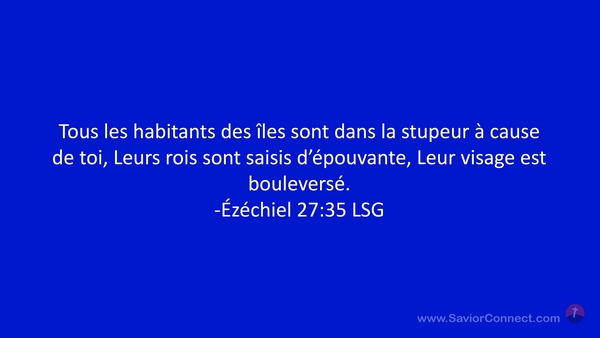Tous les habitants des îles sont dans la stupeur à cause de toi, Leurs rois sont saisis d'épouvante, Leur visage est bouleversé. -Ézéchiel 27:35 LSG