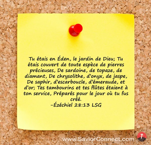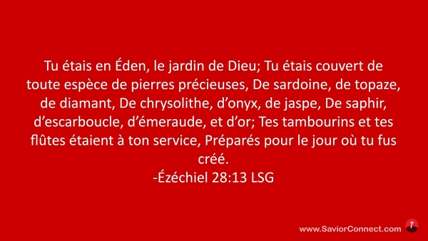 Tu étais en Éden, le jardin de Dieu; Tu étais couvert de toute espèce de pierres précieuses, De sardoine, de topaze, de diamant, De chrysolithe, d'onyx, de jaspe, De saphir, d'escarboucle, d'émeraude, et d'or; Tes tambourins et tes flûtes étaient à ton service, Préparés pour le jour où tu fus créé. -Ézéchiel 28:13 LSG