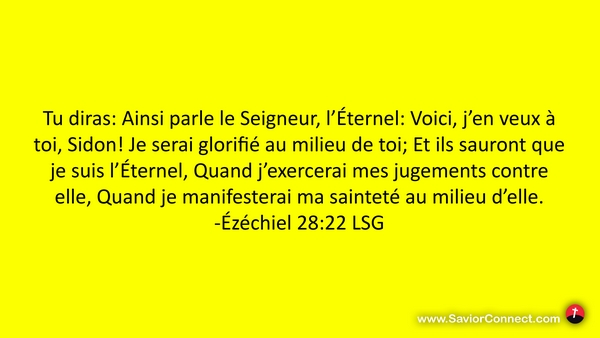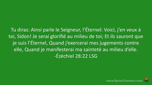 Tu diras: Ainsi parle le Seigneur, l'Éternel: Voici, j'en veux à toi, Sidon! Je serai glorifié au milieu de toi; Et ils sauront que je suis l'Éternel, Quand j'exercerai mes jugements contre elle, Quand je manifesterai ma sainteté au milieu d'elle. -Ézéchiel 28:22 LSG