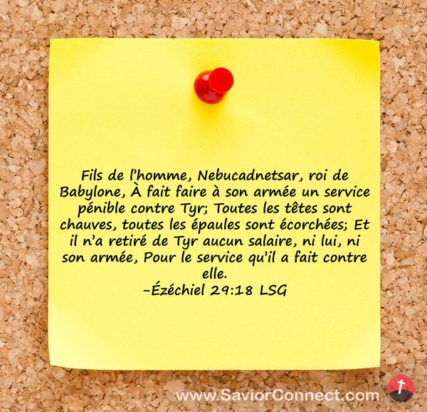 Fils de l'homme, Nebucadnetsar, roi de Babylone, À fait faire à son armée un service pénible contre Tyr; Toutes les têtes sont chauves, toutes les épaules sont écorchées; Et il n'a retiré de Tyr aucun salaire, ni lui, ni son armée, Pour le service qu'il a fait contre elle. -Ézéchiel 29:18 LSG