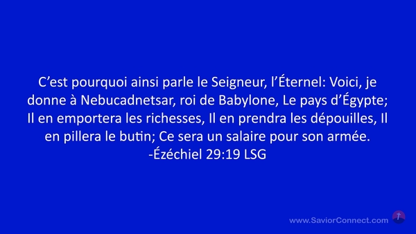 C'est pourquoi ainsi parle le Seigneur, l'Éternel: Voici, je donne à Nebucadnetsar, roi de Babylone, Le pays d'Égypte; Il en emportera les richesses, Il en prendra les dépouilles, Il en pillera le butin; Ce sera un salaire pour son armée. -Ézéchiel 29:19 LSG