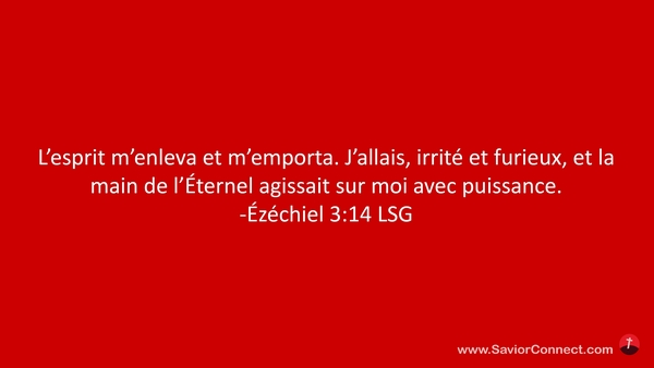 L'esprit m'enleva et m'emporta. J'allais, irrité et furieux, et la main de l'Éternel agissait sur moi avec puissance. -Ézéchiel 3:14 LSG