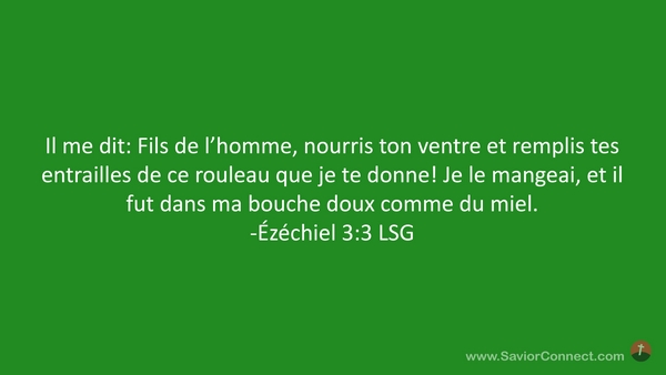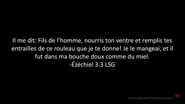 Il me dit: Fils de l'homme, nourris ton ventre et remplis tes entrailles de ce rouleau que je te donne! Je le mangeai, et il fut dans ma bouche doux comme du miel. -Ézéchiel 3:3 LSG