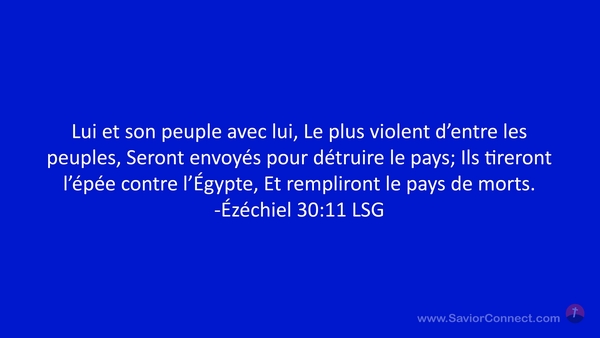 Lui et son peuple avec lui, Le plus violent d'entre les peuples, Seront envoyés pour détruire le pays; Ils tireront l'épée contre l'Égypte, Et rempliront le pays de morts. -Ézéchiel 30:11 LSG