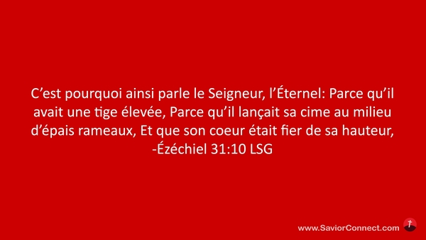 C'est pourquoi ainsi parle le Seigneur, l'Éternel: Parce qu'il avait une tige élevée, Parce qu'il lançait sa cime au milieu d'épais rameaux, Et que son coeur était fier de sa hauteur, -Ézéchiel 31:10 LSG