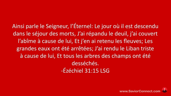 Ainsi parle le Seigneur, l'Éternel: Le jour où il est descendu dans le séjour des morts, J'ai répandu le deuil, j'ai couvert l'abîme à cause de lui, Et j'en ai retenu les fleuves; Les grandes eaux ont été arrêtées; J'ai rendu le Liban triste à cause de lui, Et tous les arbres des champs ont été desséchés. -Ézéchiel 31:15 LSG
