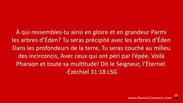 À qui ressembles-tu ainsi en gloire et en grandeur Parmi les arbres d'Éden? Tu seras précipité avec les arbres d'Éden Dans les profondeurs de la terre, Tu seras couché au milieu des incirconcis, Avec ceux qui ont péri par l'épée. Voilà Pharaon et toute sa multitude! Dit le Seigneur, l'Éternel. -Ézéchiel 31:18 LSG