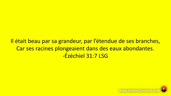 Il était beau par sa grandeur, par l'étendue de ses branches, Car ses racines plongeaient dans des eaux abondantes. -Ézéchiel 31:7 LSG