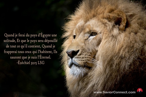 Quand je ferai du pays d'Égypte une solitude, Et que le pays sera dépouillé de tout ce qu'il contient, Quand je frapperai tous ceux qui l'habitent, Ils sauront que je suis l'Éternel. -Ézéchiel 32:15 LSG