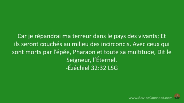 Car je répandrai ma terreur dans le pays des vivants; Et ils seront couchés au milieu des incirconcis, Avec ceux qui sont morts par l'épée, Pharaon et toute sa multitude, Dit le Seigneur, l'Éternel. -Ézéchiel 32:32 LSG