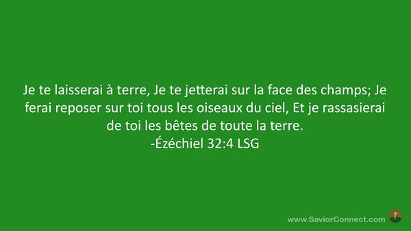 Je te laisserai à terre, Je te jetterai sur la face des champs; Je ferai reposer sur toi tous les oiseaux du ciel, Et je rassasierai de toi les bêtes de toute la terre. -Ézéchiel 32:4 LSG
