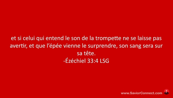 et si celui qui entend le son de la trompette ne se laisse pas avertir, et que l'épée vienne le surprendre, son sang sera sur sa tête. -Ézéchiel 33:4 LSG