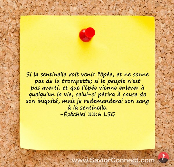 Si la sentinelle voit venir l'épée, et ne sonne pas de la trompette; si le peuple n'est pas averti, et que l'épée vienne enlever à quelqu'un la vie, celui-ci périra à cause de son iniquité, mais je redemanderai son sang à la sentinelle. -Ézéchiel 33:6 LSG