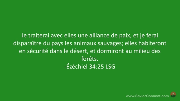 Je traiterai avec elles une alliance de paix, et je ferai disparaître du pays les animaux sauvages; elles habiteront en sécurité dans le désert, et dormiront au milieu des forêts. -Ézéchiel 34:25 LSG