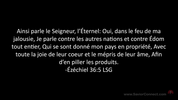 Ainsi parle le Seigneur, l'Éternel: Oui, dans le feu de ma jalousie, Je parle contre les autres nations et contre Édom tout entier, Qui se sont donné mon pays en propriété, Avec toute la joie de leur coeur et le mépris de leur âme, Afin d'en piller les produits. -Ézéchiel 36:5 LSG