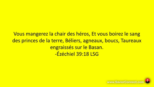 Vous mangerez la chair des héros, Et vous boirez le sang des princes de la terre, Béliers, agneaux, boucs, Taureaux engraissés sur le Basan. -Ézéchiel 39:18 LSG