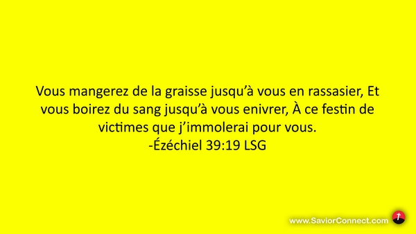 Vous mangerez de la graisse jusqu'à vous en rassasier, Et vous boirez du sang jusqu'à vous enivrer, À ce festin de victimes que j'immolerai pour vous. -Ézéchiel 39:19 LSG