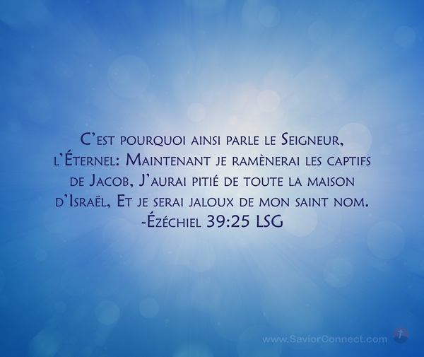 C'est pourquoi ainsi parle le Seigneur, l'Éternel: Maintenant je ramènerai les captifs de Jacob, J'aurai pitié de toute la maison d'Israël, Et je serai jaloux de mon saint nom. -Ézéchiel 39:25 LSG