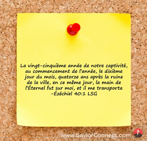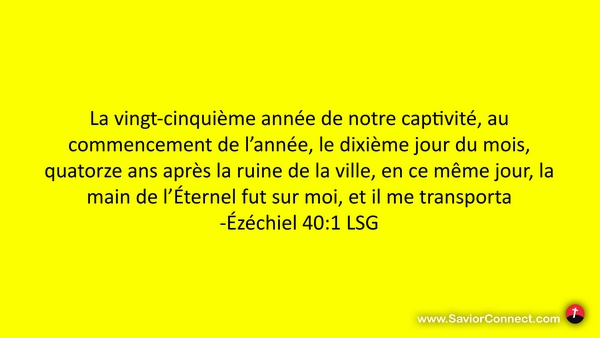 La vingt-cinquième année de notre captivité, au commencement de l'année, le dixième jour du mois, quatorze ans après la ruine de la ville, en ce même jour, la main de l'Éternel fut sur moi, et il me transporta -Ézéchiel 40:1 LSG